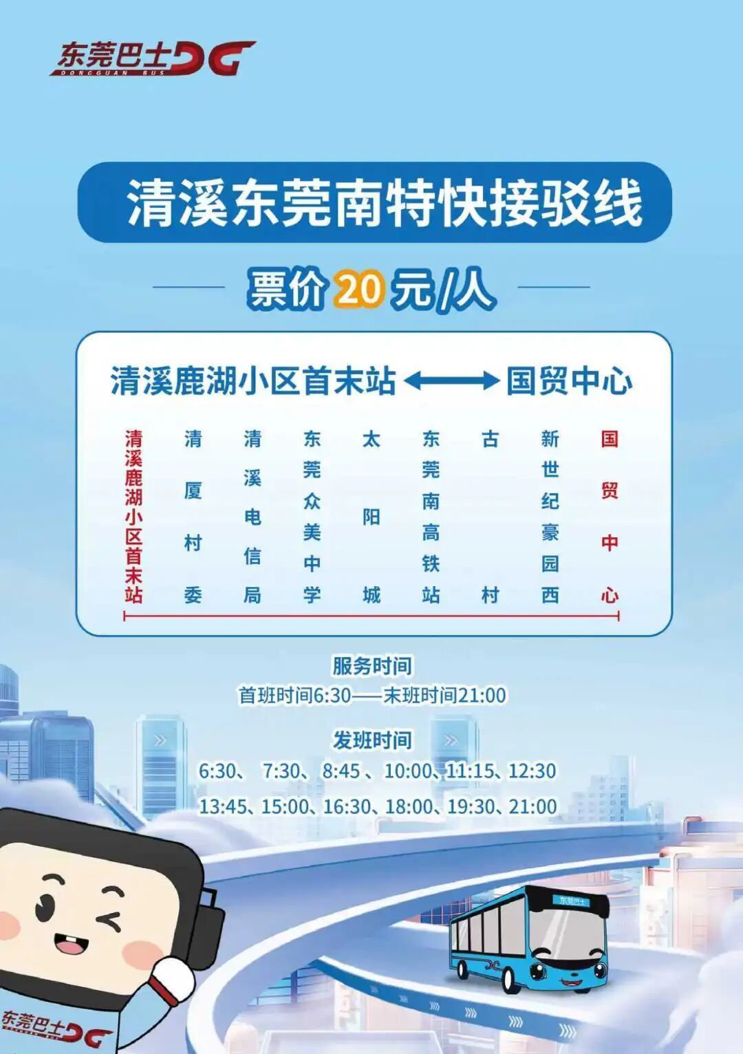 清溪鹿湖小区首末站 → 清厦村委 → 清溪电信局 → 东莞众美中学 → 太阳城 →东莞南高铁站→ 古村 → 新世纪豪园西 →国贸中心
